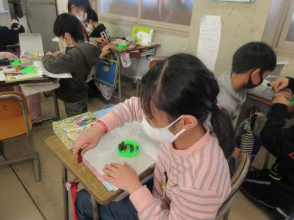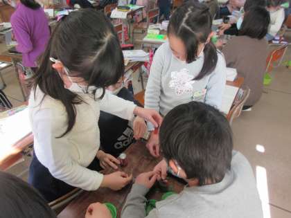 理科の学習では、磁石を使って勉強しています。前回、鉄は磁石にくっつくことに気付いた子どもたちでしたが、今日は、離れていても鉄を引き付けようとする力があることを調べました。ぴったりとくっついていないのに、磁石に引き寄せられていくことに心を動かしている子どもがたくさんいました。