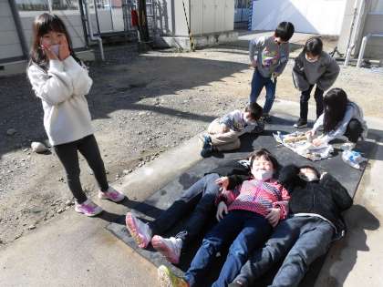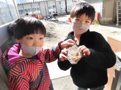休み時間の子どもたち。ポカポカ陽気に誘われて、ひなたぼっこをしています。「先生!化石を見付けたよ!」どうやらテラスに転がっている石の中から、不思議な石を見付けたようです。「宝物にしよう」と嬉しそうに話していました。