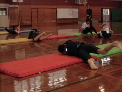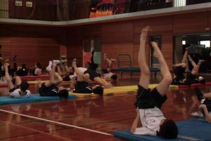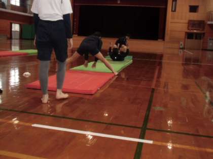 体育科の授業で、今日から「マット運動」が始まりました。まずは準備体操から。マットの上で、ペアになってストレッチをしたり、ゆりかごや自転車こぎをしたりして、体をゆっくりほぐしました。前転や開脚前転、後転等、これまで既習した技を確かめると、それぞれの高めたい技を練習するために、個々で練習場を整え始めました。これまでできた技を確かめながら、できたことに一喜一憂する子ども、新しい技に挑戦し、力試しする子ども等、一人一人がなりたい自分を見つけようと、意欲的に取り組む姿が見られています。