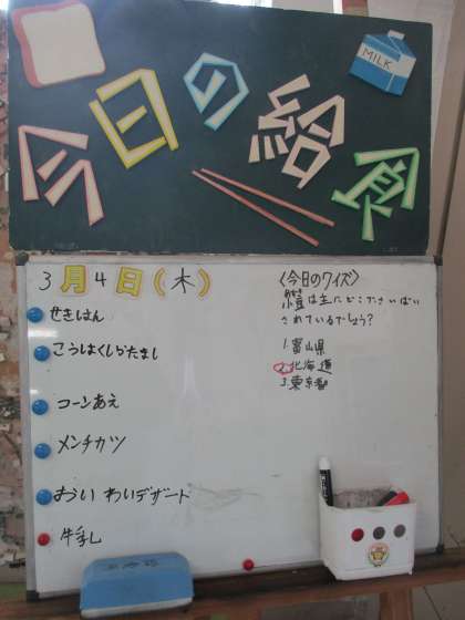 今日は、少し早いですが、6年生の卒業をお祝いする献立でした。この献立の中に、赤飯が出ていました。昔から赤い色には、魔除けの力があるとされており、お祝い事には赤飯が食べられています。