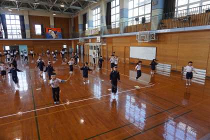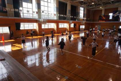 今日の体育では時間内に引っかからずに跳び続けることができるかチャレンジする練習を行いました。少しでも長い時間跳ぼうとする子どもたちでした。