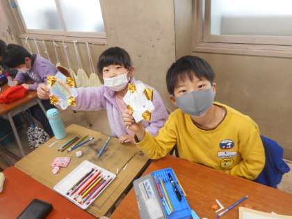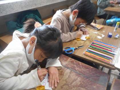 ありがとうの気持ちを込めて(1年生) 公開日 2021/03/10 更新日 2021/03/10 1年生 6年生の卒業式が近付いてきました。 1年生は、卒業生に今までの感謝の気持ちを込めて「金メダル」を作っています。 メダルを丁寧に折ったり、心のこもったメッセージを書いたりしています。 完成がが楽しみです。