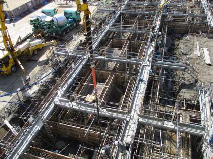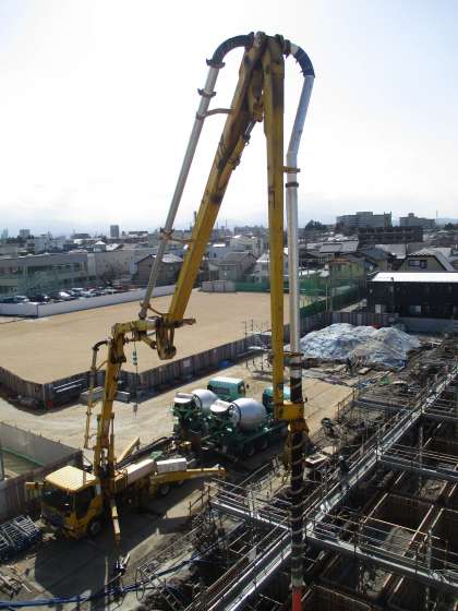 基礎へのコンクリート打設作業が行われています。ミキサー車のコンクリートを、大きなロングムーブ車を使って基礎部分に打設されていました。学校の4階よりも高いロングムーブ車の大きさに、子どもたちは驚いていました。