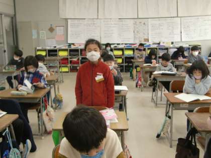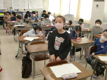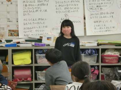 発表会の後には学習の振り返りをしました。「お話を読めば読むほど、登場人物の気持ちが分かってきました。がまがえる君はお手紙がもらえなくてやけをおこしたこともあったけど、元々は優しい人だと思いました」「かえる君はがまがえる君と一緒に喜んだり悲しんだりしてあげる友達思いの人だと思いました」「がまがえる君にお手紙を書いてあげて本当にやさしいです」「登場の場面が少ないけど、4日間かけて、お手紙を届けたかたつむり君は本当に頑張り屋さんだと思います」などなどと、登場人物の頑張りや思いやる優しい考えが伝えられた時間となりました。