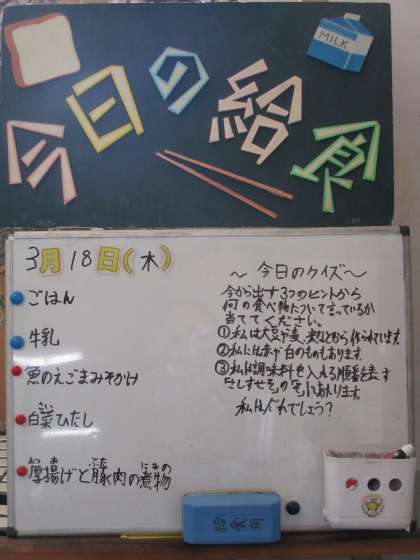 今日は、6年生が小学校で食べる最後の給食の日でした。6年間の給食ではいろいろな思い出があることと思います。みなさんの体は、食べ物で作られていますので、これからも食べることを大切に ごしてください。