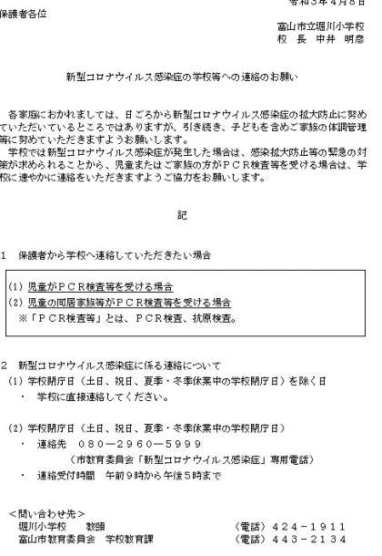 4月8日(木)「新型コロナウイルス感染症の学校等への連絡のお願い」
