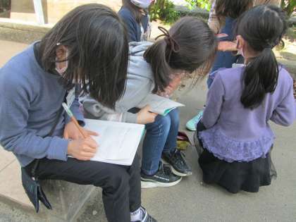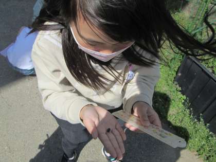 理科「春の生き物をみつけよう」では、学校の敷地内の生き物を探しています。「石をめくるとダンゴムシがいる」と誰かが言うと、みんなで石をひっくり返し、たくさんのダンゴムシを捕まえていました。足の数を数えたり体長を測ったりと、大事なことに気を付けながら丁寧に観察していました。