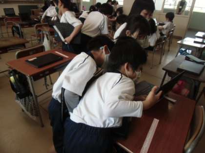 下学年でもタブレットを使う学級が増えています。「習うより慣れろ」でしょうか。本来の活動からは少しずれるかもしれませんが、活動後に自分たちグループの記念撮影をしていました。