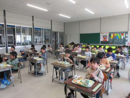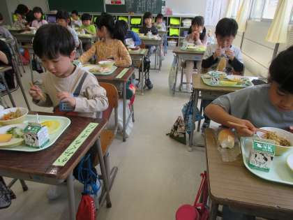 「今日の給食は何かな」(1年生) 公開日 2021/04/23 更新日 2021/04/23 1年生 「今日の給食は何かな?」と大休憩に献立表を確認するなど、給食の時間を楽しみにしている子どもたちです。苦手な物にも挑戦し、「先生、全部食べたよ」と嬉しそうにお皿を見せてくれます。自分で片付けもできるようになってきています。