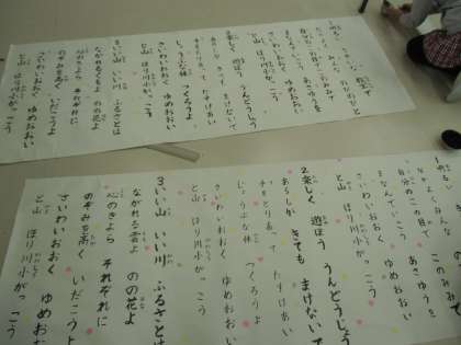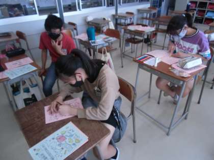 金曜日に予定されている入学を祝う集会に向けて、準備も大詰めです。校歌係では、1年生の教室に掲示する校歌の歌詞を習字で丁寧に書き、きれいに飾りつけもしました。また、招待状係では、1年生の喜ぶ顔を想像しながら、6年生が書いた招待状の最終チェックをしていました。どの係でも、自分のめあてをもち、1年生に思いを寄せながら活動している様子が伺われます。