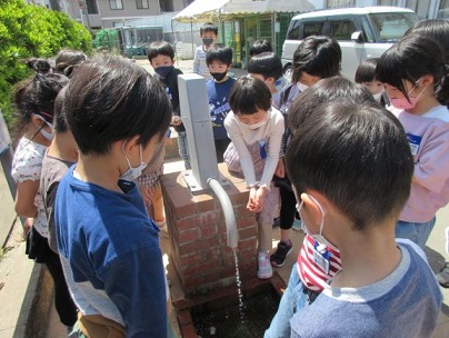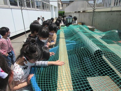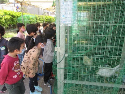 生活科「がっこうけん」で校庭を探検しました。学校にいる生き物や学校にある設備に興味をもつ子どもたちでした。
