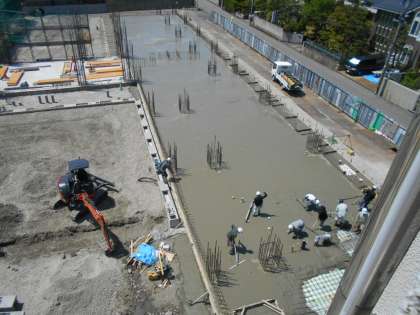 4階のトイレ前から工事の様子を眺めている子どもたちが撮影したものです。コンクリートを流し込んでおられました。