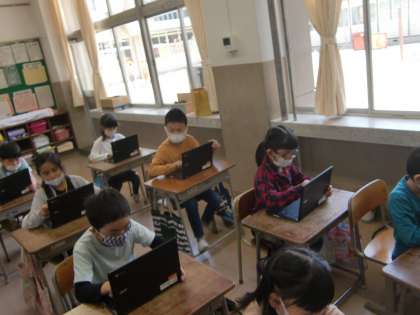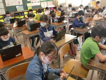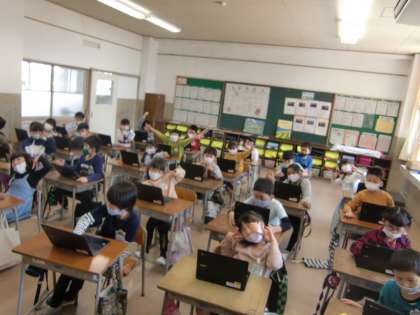 クロムブックを用いて学習や活動に挑戦しています。楽しくマナーを守り楽しく使っています。