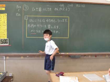 算数科の学習にて (2年生) 公開日 2021/04/26 更新日 2021/04/26 2年生 今日から「引き算引き算」の学習に取り組んでいます。問題文を読んでなぜ引き算の問題文なのか。また、足し算の筆算の仕方と同じで位をそろえて計算することなど、気がついたことなどの伝え合いをしました。