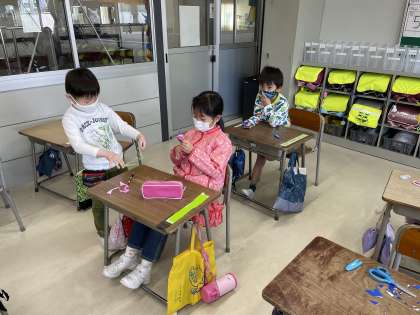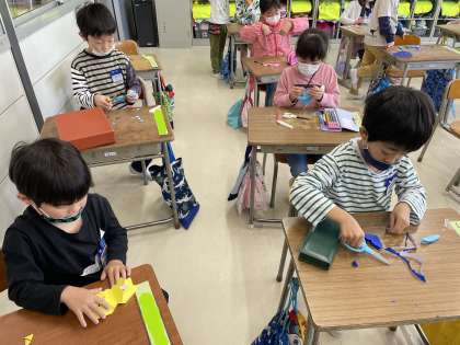 ちょきちょきかざりを仕上げているよ(1年生) 公開日 2021/04/26 更新日 2021/04/26 1年生 図画工作科の授業では、折り紙をはさみで切り取って素敵なかざりを作っています。みんなで同じ形に折り曲げたはずなのに、はさみで切り取った後、それぞれが折り紙を広げてみると、まったく違った模様が出てきます。ファミリー同士で見せ合いながら、「いいね」「すてきだね」と楽しく飾りを仕上げている子どもたちです。