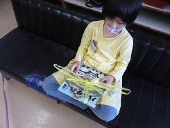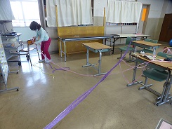 教室でいつも使っている物や場所を、タフロンテープでしばって楽しむ学習をしました。