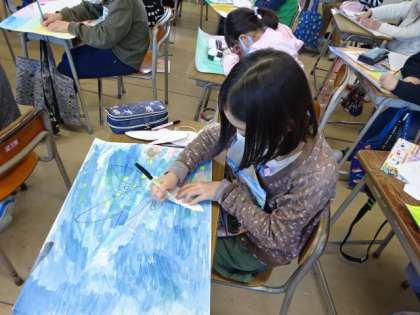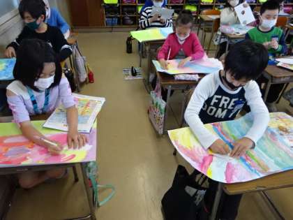 花いっぱい(3年生) 公開日 2021/04/26 更新日 2021/04/26 3年生 3年生は、図画工作科「色いっぱいの不思議な花」の学習をしています。 今日は、画用紙に自由に描いた背景の上に、花を描き足しました。花の形も大きさも花びらも違う、「不思議な花」が画面いっぱいに描かれています。この後、どんな作品になるのか楽しみです。