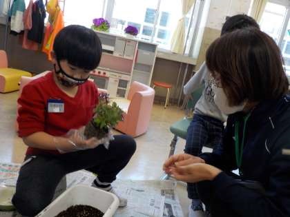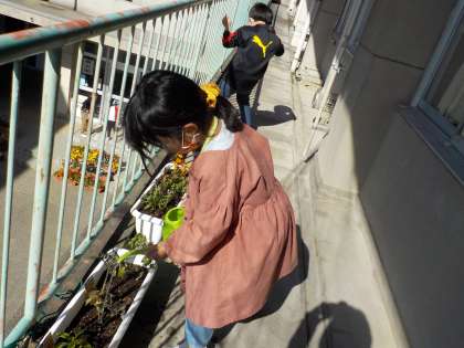 プランターに、苗を植えました。何を植えるかは全員で話し合い、一つ目のプランターにはミニトマトとパプリカ、二つ目には花の苗を植えることになりました。野菜を育てた経験のある仲間が、「ここに土が少ないから、もっと入れないと」「苗は、手の上でそっとひっくり返したら出てくるよ」と、手本を見せながら教えていました。植えた後は、水をたっぷりやりました。これから、どのように生長するか楽しみです。