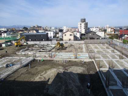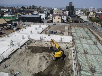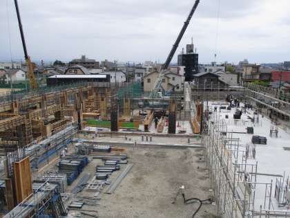 土間にコンクリートが打たれ、1階の型枠の組立が行われています。