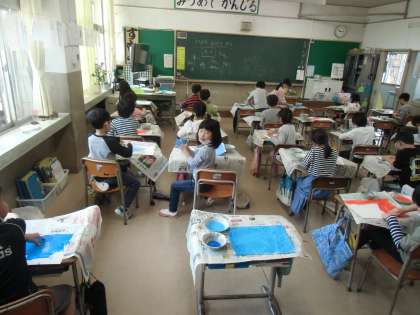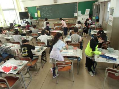 図画工作科「とろとろえのぐでかく」の学習では、指や手を使って絵の具に触ったり、紙に塗ったりしながら「空」をテーマに描きました。