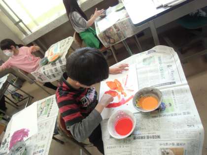 子どもたちは「混ぜるとこんな色になった」「手に付いて乾いてきたらカピカピする」など、それぞれが絵の具と触れ合いながらいろいろなことを感じていました。