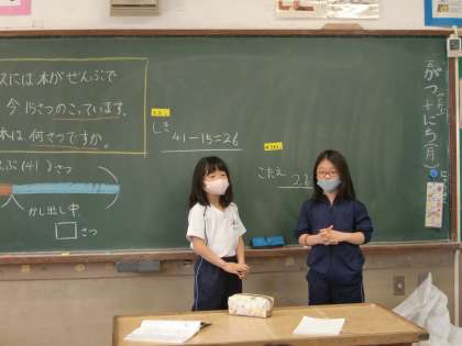 算数の学習では (2年生) 公開日 2021/05/10 更新日 2021/05/10 2年生 引き算の筆算の学習もまとめに入りました。今日は、たしかめの計算の仕方を学習しました。仲間同士伝え合いながら熱心に問題に取り組む皆さんです。