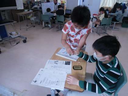 4年理科「からだが動くしくみ」の学習で、実際に自分の腕を曲げたり伸ばしたりして筋肉や関節の動きを調べました。
