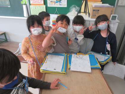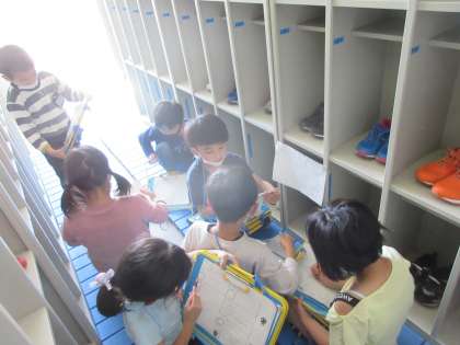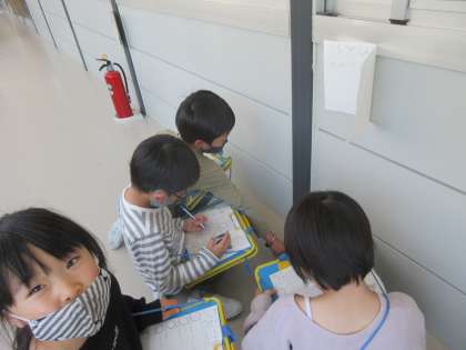 くらしの時間で、スタンプラリーをして楽しかった経験を話し、学校でもやってみたいと話した子どもの発案で、スタンプラリーを計画し、今日「すたんぷらりぃぱぁてぃ」を開きました。家でクイズを考えたり、スタンプを用意したりするなど、家でも学校でも進んで準備をしていた子どもたちです。そのおかげでファミリーごとにスタンプラリーを楽しむことができました。