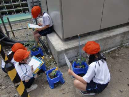 先週植えた野菜の苗も少しずつ生長しています。今日は、野さい日記を書きました。苗の葉や茎や花などを目で見て手で触り、鼻でにおいを嗅ぎながらじっくりと観察しました。