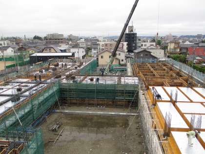 4階からの敷地西側の様子です。1階の壁型枠工事が進み、床型枠工事が始まっています。
