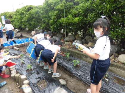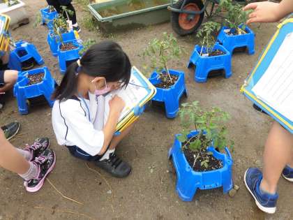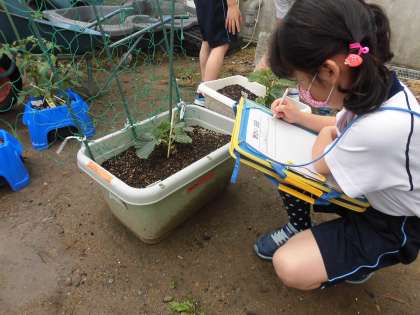 野菜の苗や種を植えて、2週間が経過しました。日当たりの状態からか、残念ながら枯れてしまった野菜もありましたが、葉が増えたり、つぼみができたり、実ができてきたり、野菜が少しずつ生長してきたようです。今日はお世話をしたり、観察したりしました。