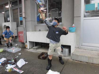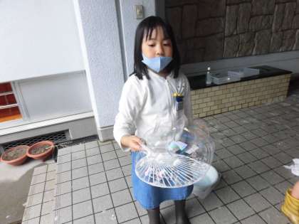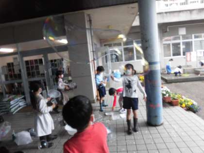 5月17日、2年4組では「しゃぼんだま」の学習に取り組みました。前回の学習の反省から、家から新たな道具やしゃぼん液を持ってきて、さらに活発に活動していました。