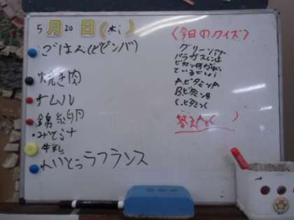 5月20日 今日の献立 公開日 2021/05/20 更新日 2021/05/20 給食室 ビビンバは、韓国料理です。ゆでた野菜をごま油やしょうゆであえたナムル、肉をいためたものをごはんの上にのせてまぜて食べます。韓国では、ごはんの上に5種類の具材をのせて食べるそうです。