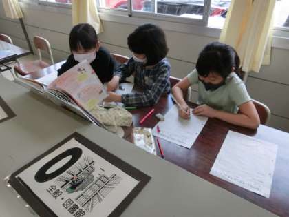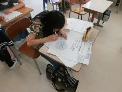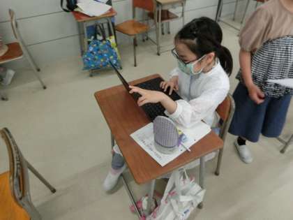 総合的な学習の時間に「SDGs−わたしにできること−」に取り組んでいます。クロームブックや本で調べる人、ポスターで呼びかける人など、わたしにできることに取り組む子どもたちです。