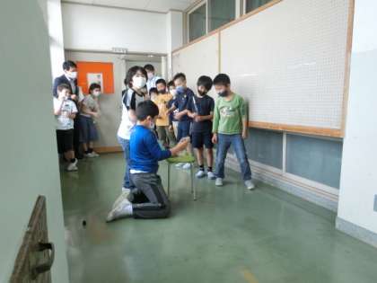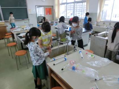 空気でっぽうやペットボトルロケットなどを通してとじこめた空気と水の性質について考えている子どもたち。不思議や発見がたくさんあるようです。