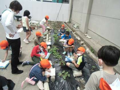 子どもたちは、野菜の色、形、大きさや、前回と変わったところに注目し、やさい日記を付けていました。