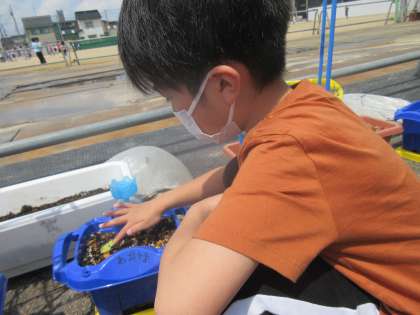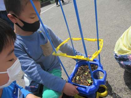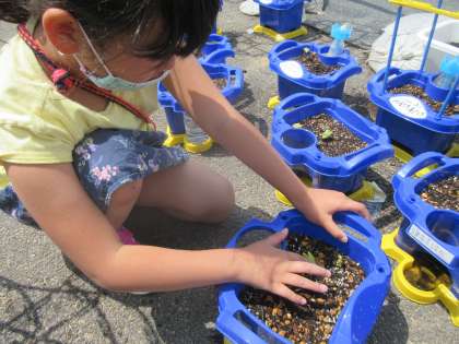 アサガオの子葉が出てきました。子どもたちは、日に日に変わるアサガオの成長にびっくりしている様子です。茎が太く強いアサガオにしたいと、休み時間ごとになでて接触刺激を与えている子どももいます。