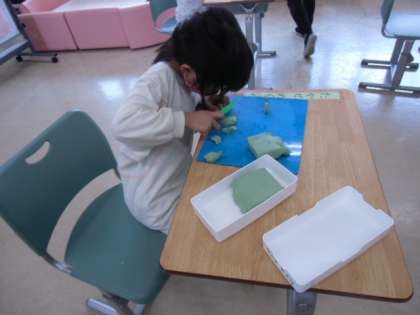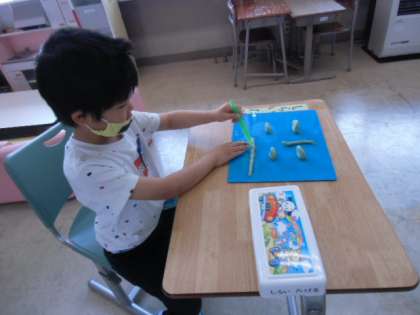 ひもひもねんど(なかよし級) 公開日 2021/05/25 更新日 2021/05/25 特別支援 図画工作科「ひもひもねんど」の学習では、「へび」や「長いパン」等、それぞれがイメージしたものをつくりました。 「粘土が冷たい」「やわらかくて、いろんな形になる」と手で粘土の感触を楽しみながら活動しました。