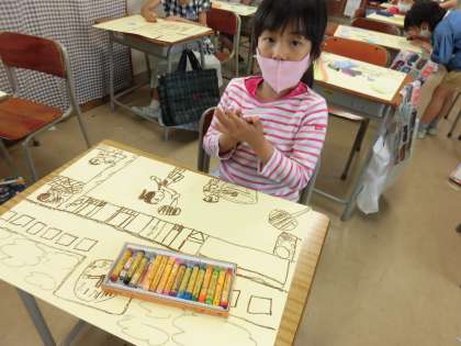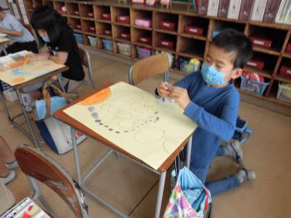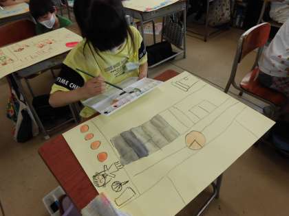 2年4組は、「しゃぼんだま」の学習を進めています。図画工作科でも、「しゃぼんだま」と聞いて、自分が思い浮かべたイメージを画用紙に描いています。前回までは、思い思いのしゃぼん玉を描き、現在はそのしゃぼん玉の絵を貼る背景を描いています。