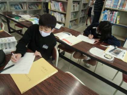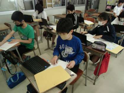 6年2組では、外国語・総合的な学習の時間に「People living in the world」の学習に取り組んでいます。世界にある国や、そこに生きる人々のくらしについて、自分の興味のあるところから調べています。クロムブックはもちろん、図書室で本を探したり、司書の先生に聞いたりしながら、自分の知りたいことを一生懸命解明しようとしています。