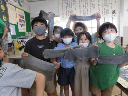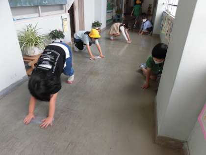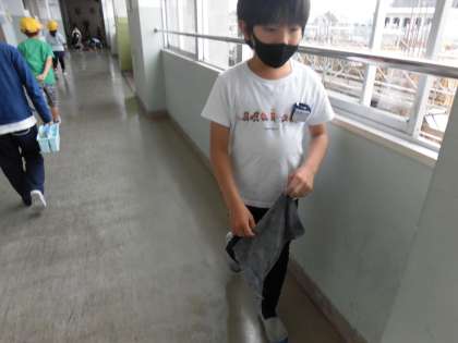 図画工作科で水彩を使用した後、廊下や教室に水彩バケツからこぼれた色水が落ちています。それを見た、片付けが終わった子どもたち。何と雑巾を持ってきて、色水をきれいに拭きとっています。そのおかげで、廊下も教室もピカピカになりました。仲間のために、誰に言われるでもなく、自分から働きかけることのできるすてきな子どもたちです。