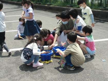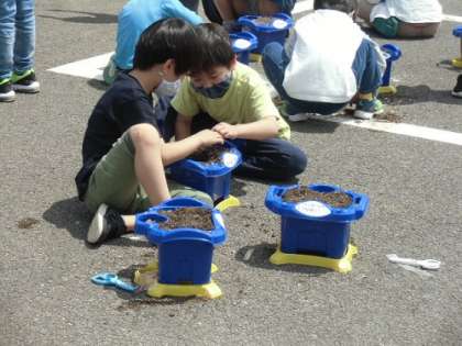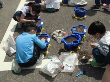1年生はあさがおを育てています。写真は種を植えた時の様子です。あさがおが芽を出さないかと、楽しみにしながら、毎日観察をしています。放課後にも様子を見に来る仲間もいます。生長が楽しみです。