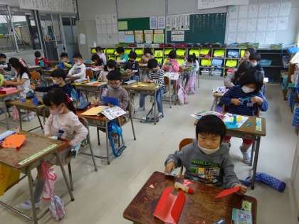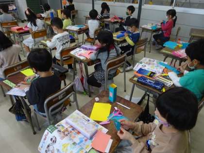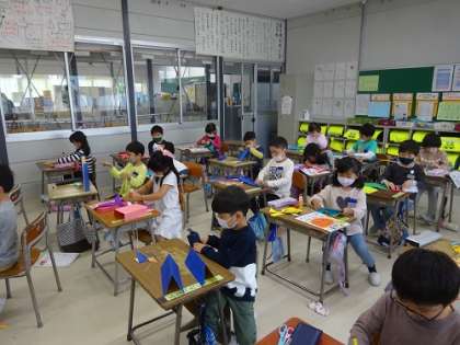 図画工作科では、「おって たてたら」という学習に取り組んでいます。工作用紙を折って、切って、立てて、用紙を様々なものに見立てて作品を作っています。みんな真剣に取り組んでいます。