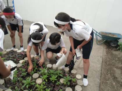 理科では、動物や植物のからだのはたらきについて学習しています。今後の実験で使用するホウセンカも、順調に育ってきています。ホウセンカの様子気にかけ、様子を見に行っている6年生です。