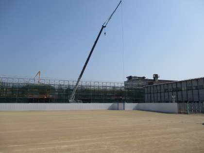 上の写真は、グランドからのB工区です。外部足場が3階部分まで組まれ、旧校舎が隠れてきています。