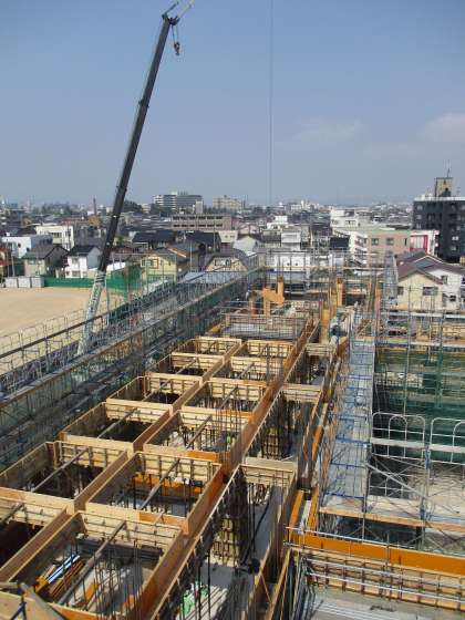 下の写真は、屋上から撮影したB工区の様子です。2階部分の壁や梁の型枠を取り付ける作業が進められています。