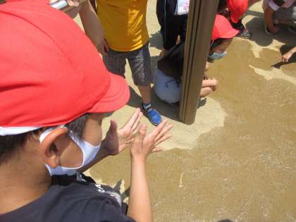 水の流れ方(4年生) 公開日 2021/06/11 更新日 2021/06/11 4年生 理科の学習では、どのようなところに水が溜まりやすいかについて考えています。実際に水を流してみると、下がっているところやへこんでいるところに水が自然と溜まっていく様子が見られました。水たまりは、このようにしてできていることを実感していった子どもたちです。