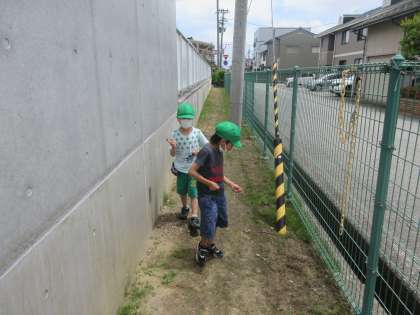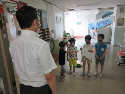 生活科「わたしの あさがお」2(1年生) 公開日 2021/06/15 更新日 2021/06/15 1年生 アサガオを自分の身長より高くして、お母さんにみてもらいたいAさん、だれよりも高くアサガオを育てたいBさん、アサガオとパーティーしたいCさんなどが、アサガオを育てる場所の相談をするために、教頭先生に会いに行きました。プール横と南玄関横に種を直接植えて、育てることになりました。