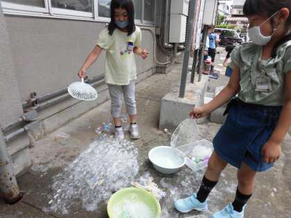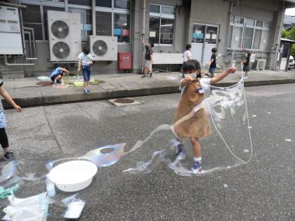 2年4組の「しゃぼんだま」の学習は、回数を重ねるごとに、子どもたちが工夫を凝らしながら活動しています。