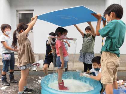 その他にも、しゃぼん玉をたくさん出して、しゃぼん玉の山を作る子どもたち、絵の具を混ぜて色付きしゃぼん玉を作ろうとしている子どもたち等、想像力豊かに活動を深めたり広めたりしています。